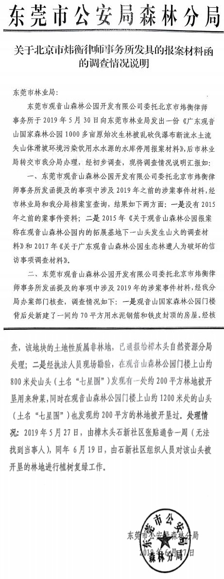 东莞市公安局森林分局在2019年6月27日出具给东莞市林业局的《关于北京市炜衡律师事务所发具的报案材料函的调查情况说明》显示,经执法人员现场勘验,在观音山森林公园门楼上山约800米处山头(土名“七星围”)发现有一处约 200平方米林地被开垦用来种菜,同时在观音山森林公园门楼上山约1200米处的山头(土名“七星围”)也发现约200平方米的林地被开垦过。